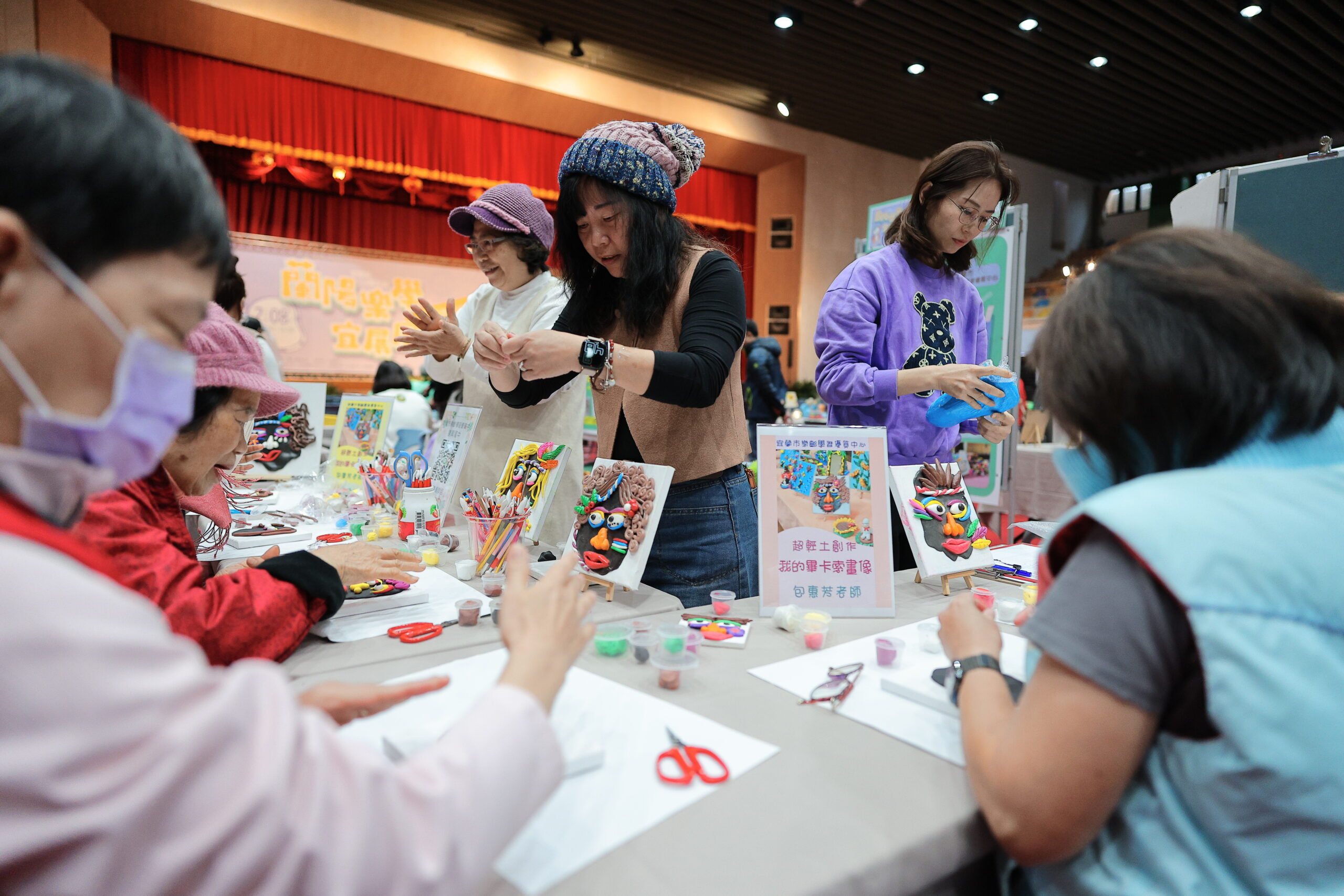 靜態展示區展出各鄉鎮市特色內容,來自宜蘭與羅東社區大學的學員們,帶來豐富的學習創作;而各樂齡學習中心的長輩們則展示豐富的編織、繪畫與各項精緻的手作藝品。這些作品不僅是技藝的磨練,更紀錄長者們在退休後如何透過學習找到自我價值,將生活經驗轉化為藝術美學。另外,為了讓民眾親身體驗學習樂趣,現場也設置了多組的「互動 DIY 體驗區」,包含木工手作、春聯拓印、吉祥結以及貓頭鷹鑰匙圈,吸引許多家長帶著孩子一同參與,落實代間學習的理念,整個活動規劃也展現出動靜皆宜,樂齡不老化的精神。