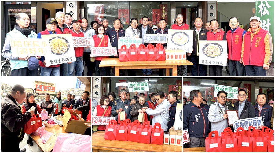 「愛心年菜送獨老」善行在簡松樹議員服務處發動,現場並有多位民代、村長熱烈響應。準備的年菜有:懷舊手作油飯、鹹香臘肉雞湯、金絲蛋酥西魯年菜,都是色香味俱全的在地傳統好料理。