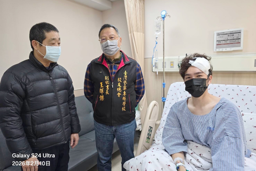 ▲警專校友總會幹部赴院探視,與受傷員警及相關人員合影,傳遞支持與鼓勵。(圖/警專校友總會提供)