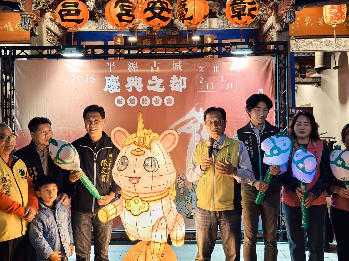 林世賢市長10日晚上6點在慶安宮由主持隆重的點燈儀式,全市沿永樂街與民族路長達1,000公尺,共計有4個主題城門意象燈飾、三角公園圓環上「祥城天馬」主題花燈、還有彰化車站、彰化藝術館與彰化公所廣場前充滿童趣大型充氣半半公仔裝飾與燈籠牆,以及慶安宮、關帝廟、聖王廟廟宇花燈也同步點亮,一起陪伴遊客過新年。
