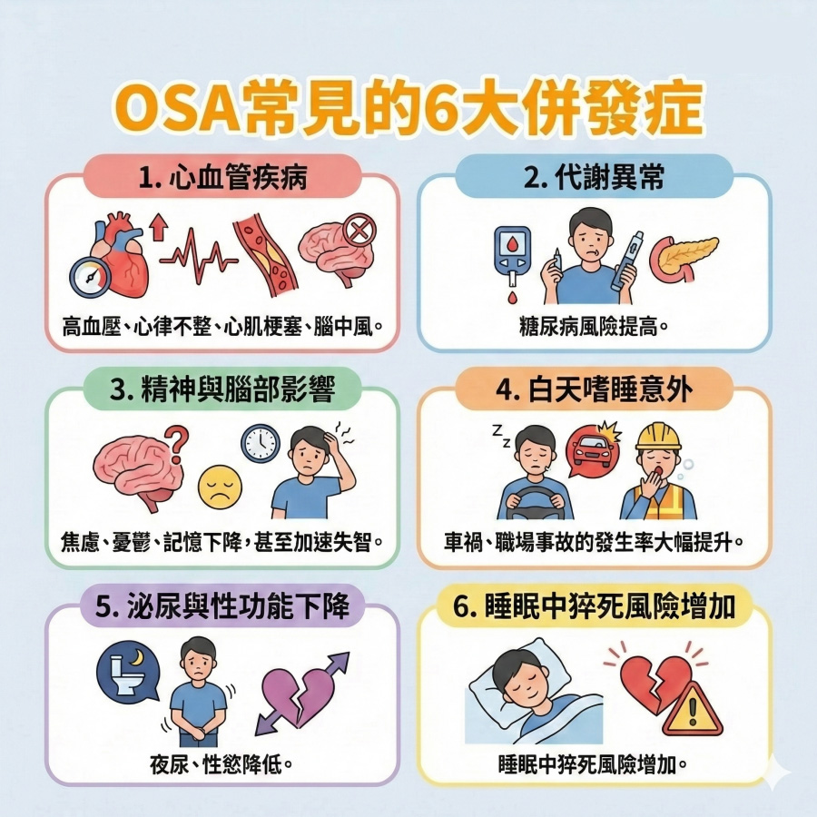 林偉傑醫師也提醒,低溫或溫差大,都可能加重睡眠呼吸中止症的症狀,千萬不可輕忽,畢竟長期慢性缺氧,除了會導致白天嗜睡、專注力和記憶力下降,男性甚至會出現性功能障礙,尤有甚者還會有心血管疾病和中風的風險,所以如果出現長期打呼、鼻塞或睡眠品質不佳,應及早接受專業評估與治療。