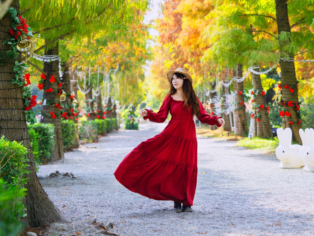 ▲園區漢服體驗推出期間限定優惠,漫步於成美公堂與落羽松景致之中,彷彿穿越古今。(圖/成美文化園提供)