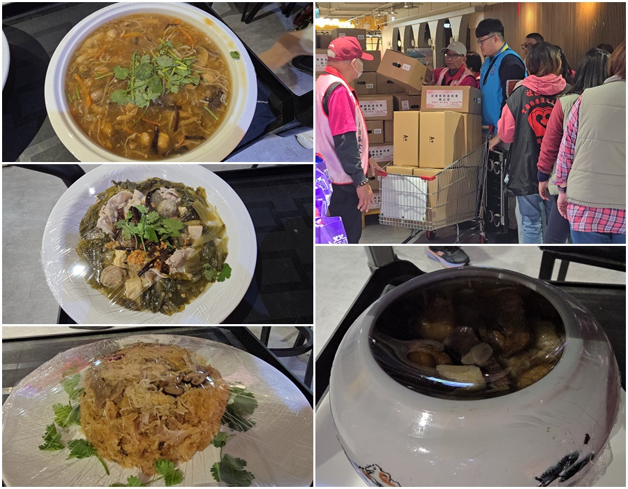 每組愛心年菜有:開運佛跳牆、開運干貝海鮮羹、開運櫻花蝦米糕、酸菜白肉鍋等美味佳餚,令人食指大動。