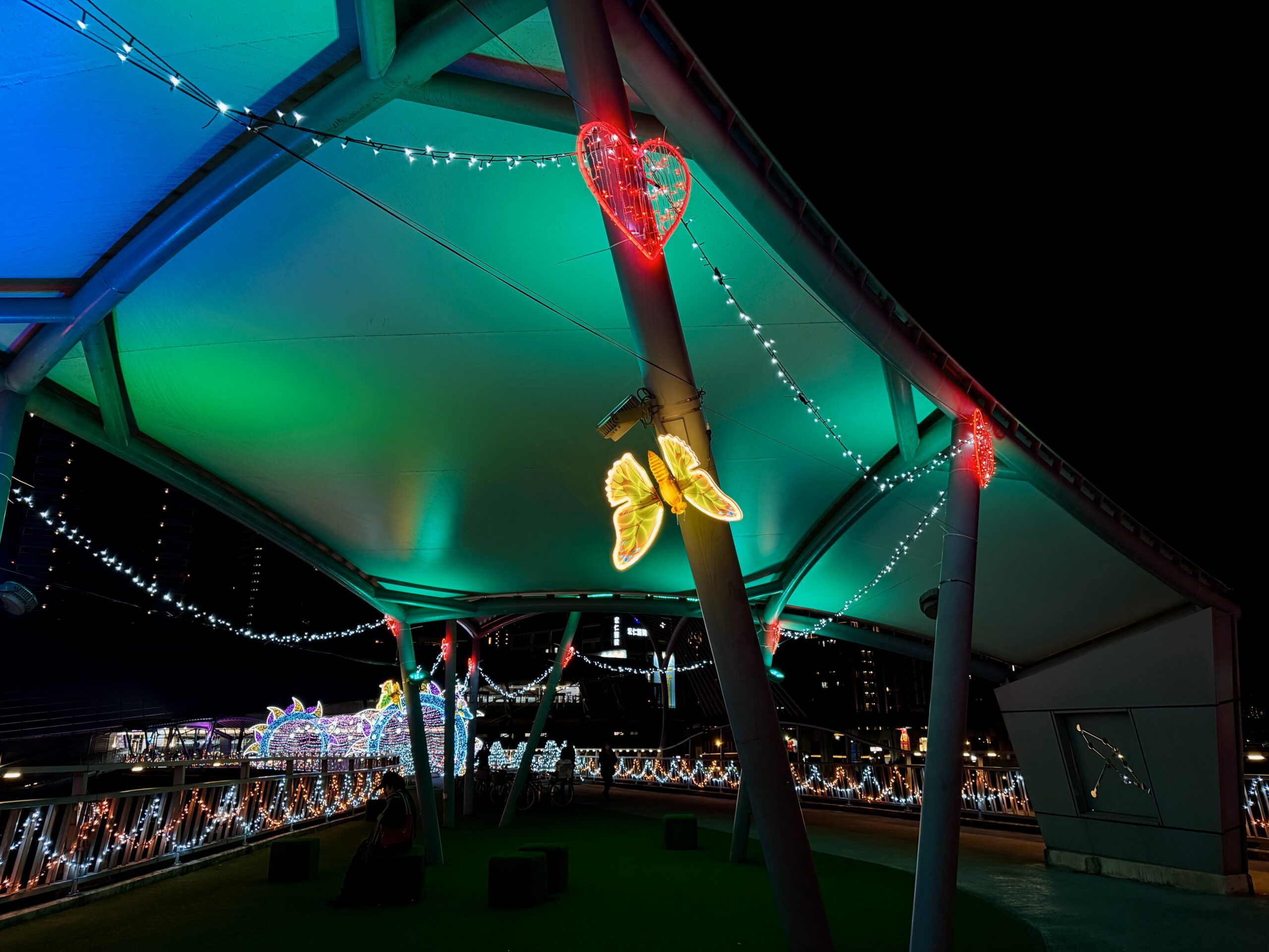 走上辰光橋,光雕主題之一「星戀步橋」以水波紋燈光鋪陳橋面,光影隨腳步流動,如月色輕灑河面,搭配白光與珊瑚橘星星燈串,營造滿滿儀式感;延伸至「星戀草坪座」,柔和燈串搭配飛舞的蝴蝶、蜻蜓燈飾,將成為情侶拍照、親子停留的夢幻打卡點。