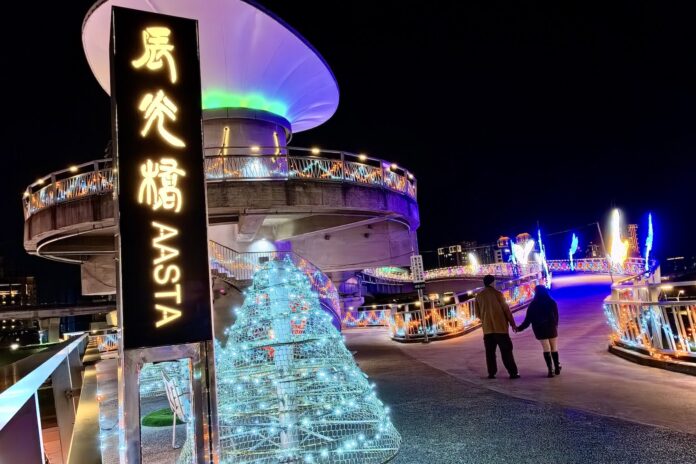 ▲光影情人橋-透過橋體燈光變化,展現辰光橋夜間浪漫風貌,成為情人節期間的代表性地標圍。(圖/新北市高灘處 提供)