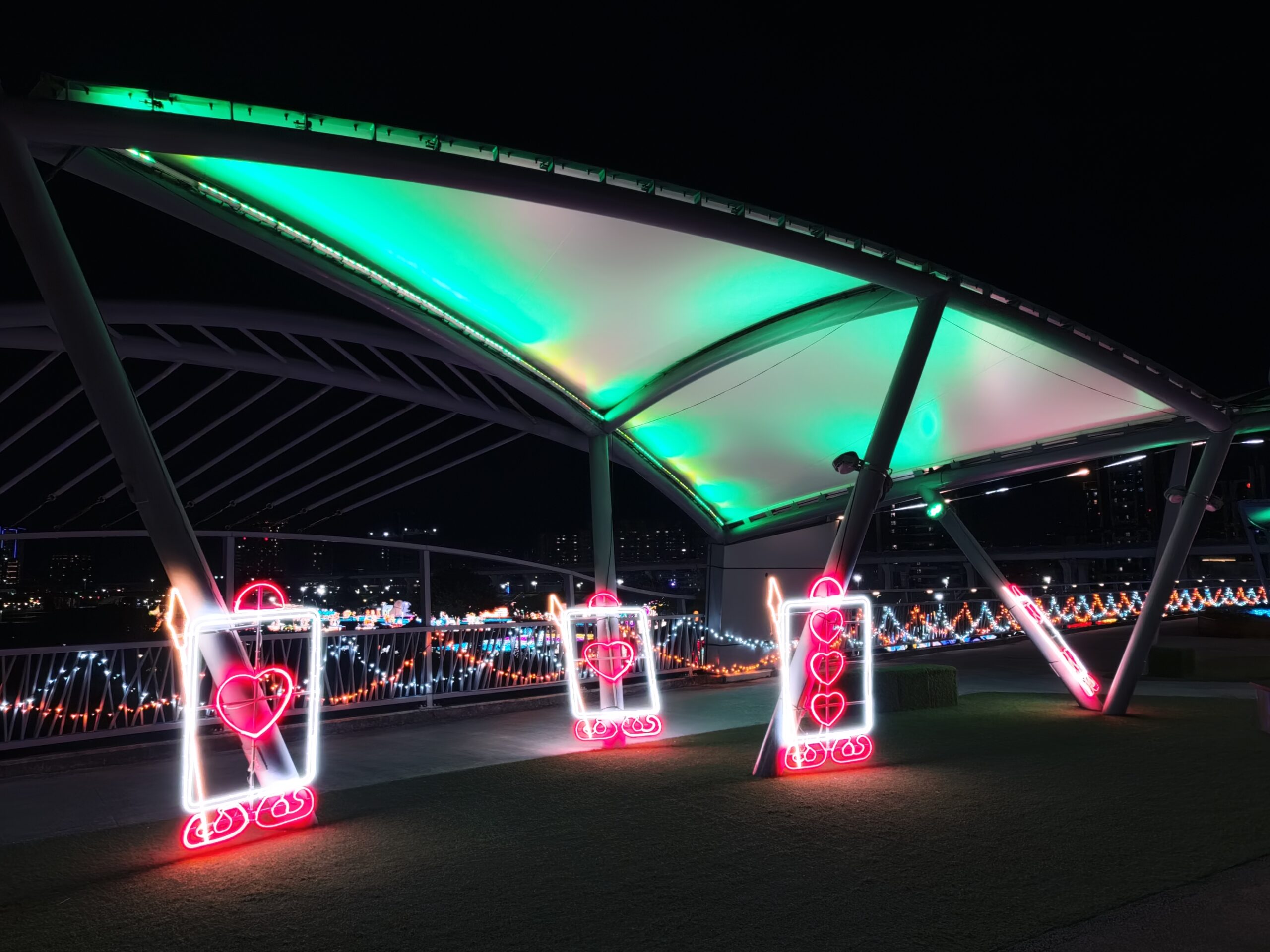 橋中央的「心境奇域」更是一大亮點,童話風格的奇幻夢境場景,懸掛紅色愛心燈片、流星光影與撲克牌愛心元素交錯,彷彿踏入一座只屬於夜晚的秘密國度,讓大小朋友都能沉浸其中。