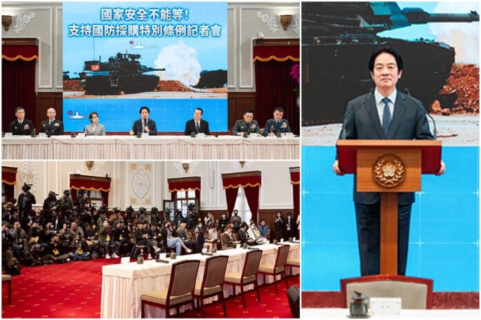 行政院提出「國防特別預算條例」草案,迄今仍在立法院未能付委審查,總統賴清德11日率同副總統蕭美琴、國防部長顧立雄、參謀總長梅家樹,以及陸軍司令呂坤修、海軍司令蔣正國、空軍司令鄭榮豐等人,特別召開「國家安全不能等!支持國防採購特別條例」記者會,再次強調國防特別預算的重要性,籲請朝野與國人支持國防採購特別條例。