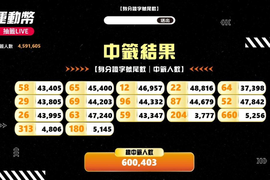 運動部說明,為深化全民運動風氣,正式將「青春動滋券」轉型為「運動幣」,並於1月26日至2月8日開放民眾登記參加抽籤,符合資格者超過459萬人。今(12)日舉辦「115年運動幣抽籤直播活動」,預計抽出60萬名幸運民眾,由入圍114年體育運動精英獎最佳新秀運動員的擊劍選手李讓公開抽籤,只要登記驗證成功,且身分證號末碼符合上述的身分證末碼數字,即可領用。