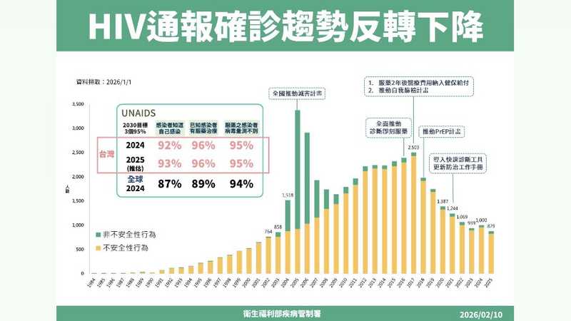 疾管署監測資料顯示,2025年新增確診通報本國籍愛滋病毒感染人數為879人,創2004年以來新低。另就聯合國愛滋規劃署(UNAIDS)2030年「95-95-95」目標(95%感染者知道自己感染、95%已知感染者接受治療、95%接受治療者病毒量成功抑制),我國2025年預估已達「93-96-95」,但仍約有7%感染者尚未知自身已感染。李佳琪組長也說,近年各項預防措施推動後,新增愛滋病感染人數自2018年起呈下降趨勢,治療與病毒控制指標已接近國際目標,因此「把尚未被發現的人找出來」仍是防治關鍵,篩檢依舊是最重要的預防工具之一。