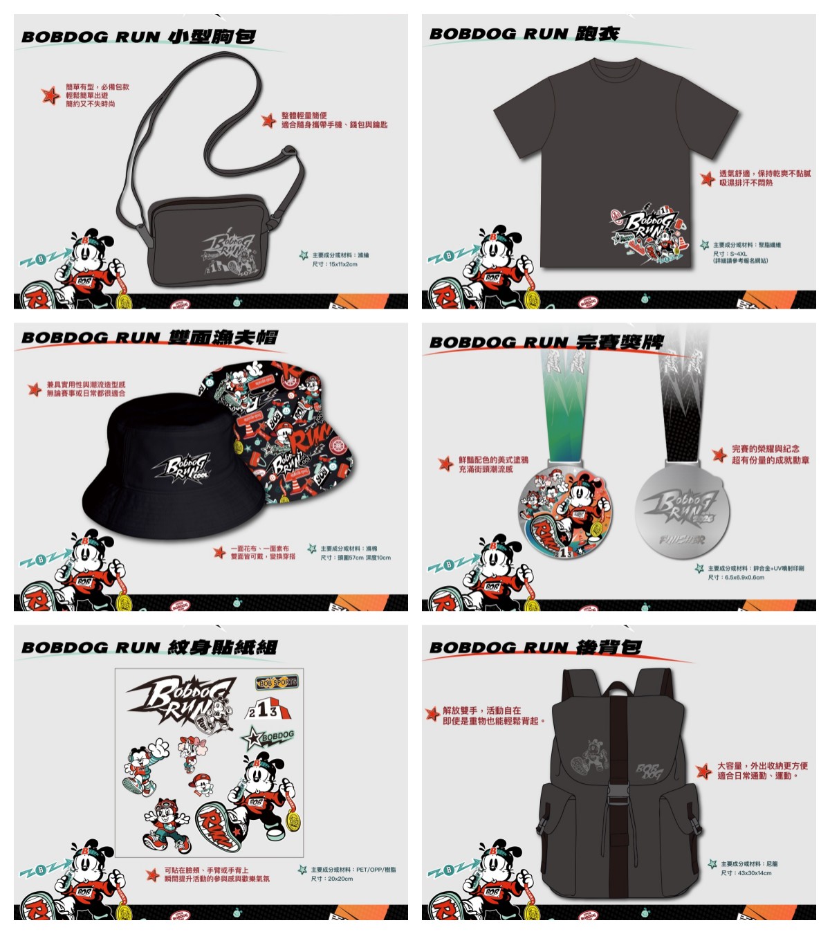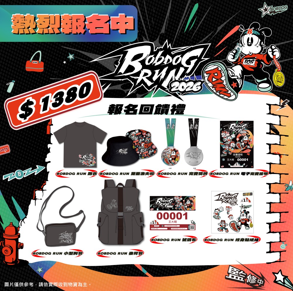 凡完成報名即可獲得2026 BOBDOG RUN 潮流回饋禮,內容包含:號碼布、跑衣、小型胸包、後背包、雙面漁夫帽、紋身貼紙組、電子手冊,完賽後還可以擁有潮流完賽獎牌 ! 不只是跑步,更是收藏屬於 2026 年的城市潮流印記。