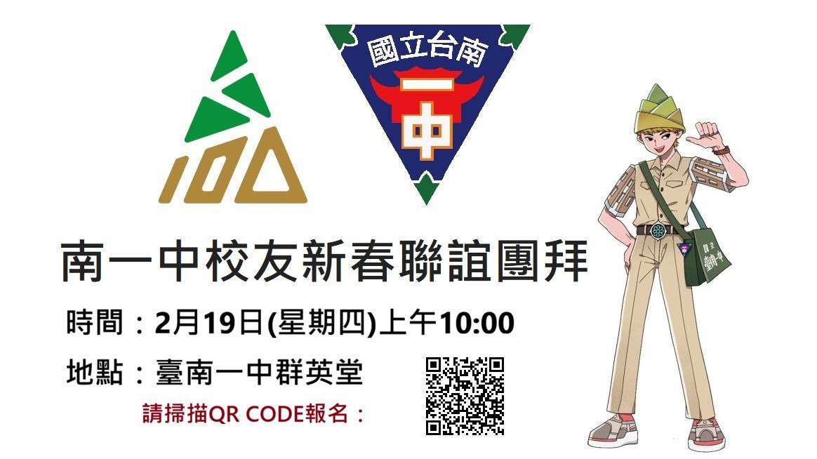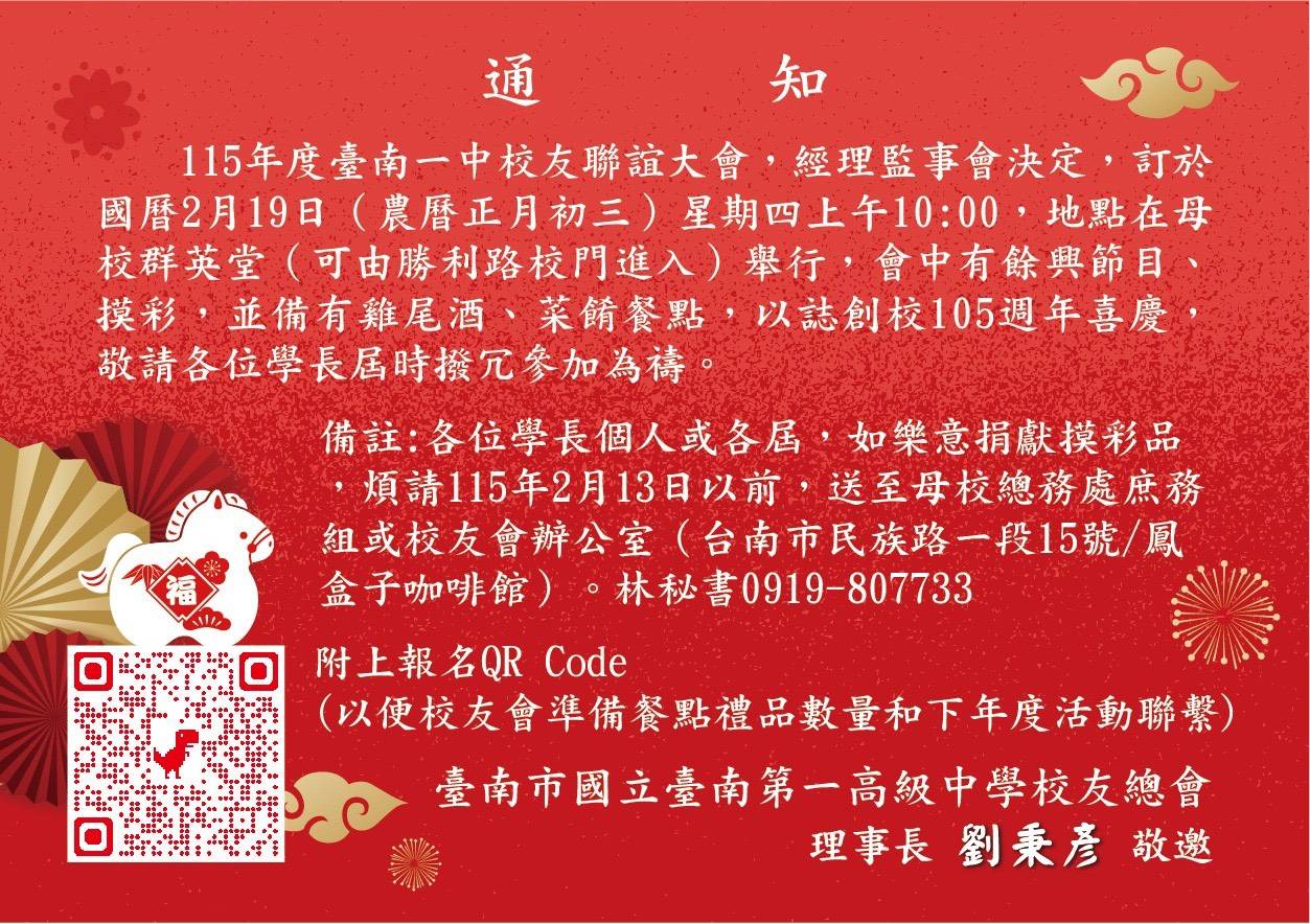 春回大地,情誼再續,台南市台南一中校友總會將於大年初三2月19日(星期四)上午10時,在母校群英堂舉辦「南一中校友新春聯誼團拜」,邀請歷屆校友返校團聚,共敘竹園岡情誼,活動當日備有餐敘、摸彩及豐富紀念品,獎金與獎品精彩可期,場面熱鬧溫馨,為新的一年揭開嶄新序幕。