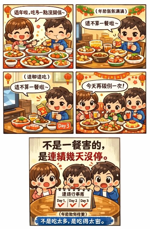 過年不只是幾頓飯,而是一段連續的生活節奏。真正讓身體感到負擔的,往往不是哪一道年菜,而是好幾天甜的、鹹的、油的輪流出現,讓身體沒有機會喘口氣。與其要求自己什麼都不能吃,不如試著把年節拉回「比較接近日常」的狀態。