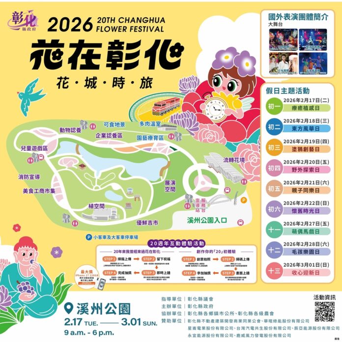 走過二十年歲月遞嬗,被譽為全台春節走春指標的「花在彰化」,2026年迎來嶄新里程碑。本屆活動以「花城時旅」為策展主軸,結合花藝景觀與時序意象,自2月17日(大年初一)至3月1日於溪州公園盛大登場,於舞台區特別安排20場國際團隊演出節目。彰化縣長王惠美邀請全國鄉親蒞臨走春,在花海之中展開一場跨越時空的春日漫遊。