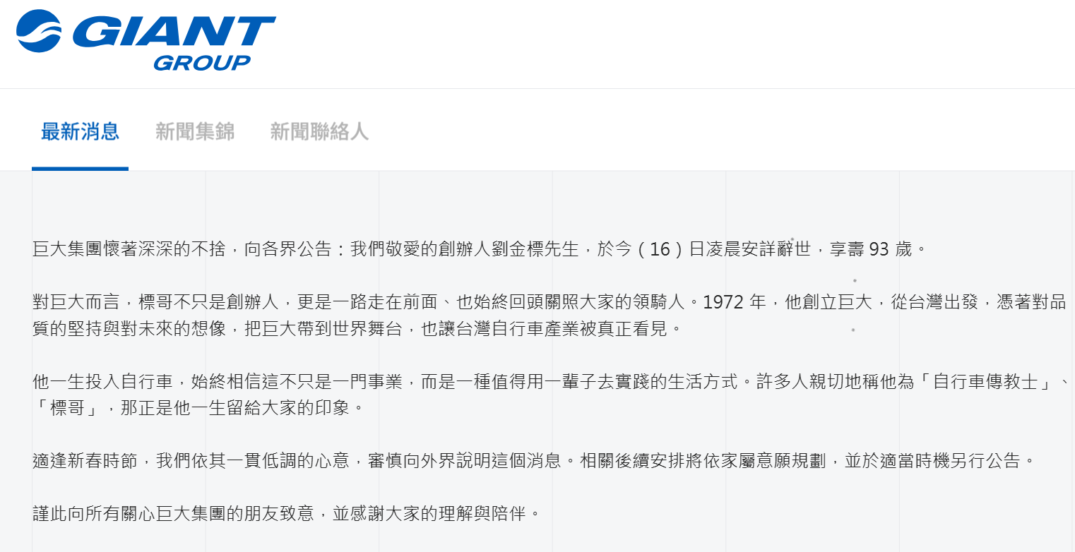 【Lai傳媒 記者爆料網 蔡智銘/台中報導】 巨大集團(Giant Group)今日(16日)稍早發布新聞表示,集團創辦人、被譽為「自行車傳教士」的劉金標先生(標哥),於今日凌晨在家人陪伴下安詳辭世,享壽 93 歲。