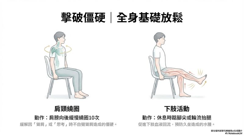 • 肩頸繞圈:肩膀緩慢向後繞圈10次,緩解因「摸牌」或「思考」造成的聳肩僵硬。