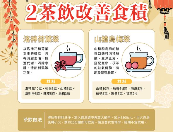 針對年節常見的胃脹氣與油膩不適,游晏楠中醫師建議,可在家自行準備消積解膩的養生茶飲,例如以洛神花、荷葉、山楂、決明子、陳皮與烏梅等中藥材,將材料洗淨後放入過濾袋中,加入約1500毫升清水,以大火煮滾後轉小火續煮約20分鐘即可飲用,適合餐後或感到油膩時少量飲用。另有以山楂與烏梅為主,搭配黨參、茯苓與少量甘草的茶飲,可幫助消積、生津並調整腸胃機能。不過游醫師也提醒,孕期或生理期間女性不宜飲用,飲用前應留意自身體質狀況。