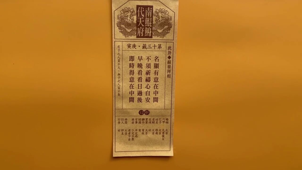 南鯤鯓代天府表示,國運籤今上午在五王殿前依古禮進行,由總幹事侯賢名擔任抽籤官、常務監事邱敏華擔任擲筊官,過程中需透過擲筊請示,直到獲得允筊才能抽出籤詩。廟方指出,現場在抽到第10支時擲出三聖筊,最後抽出第13籤,籤名為「蘇秦拜相」,被視為有「努力後出頭」的象徵意涵。