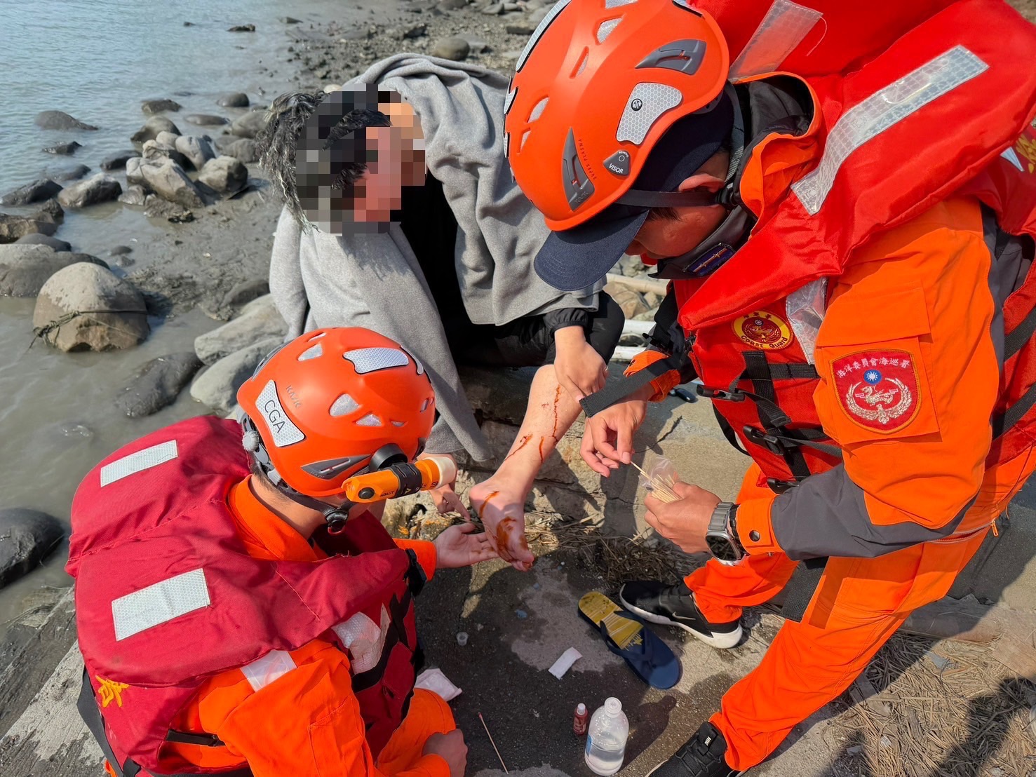 釣客手腳擦挫傷海巡隊員給予消毒等處置。翻攝畫面