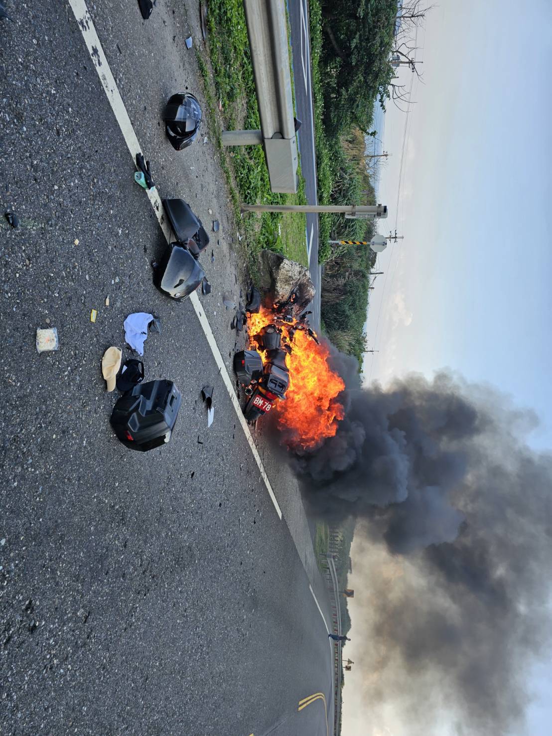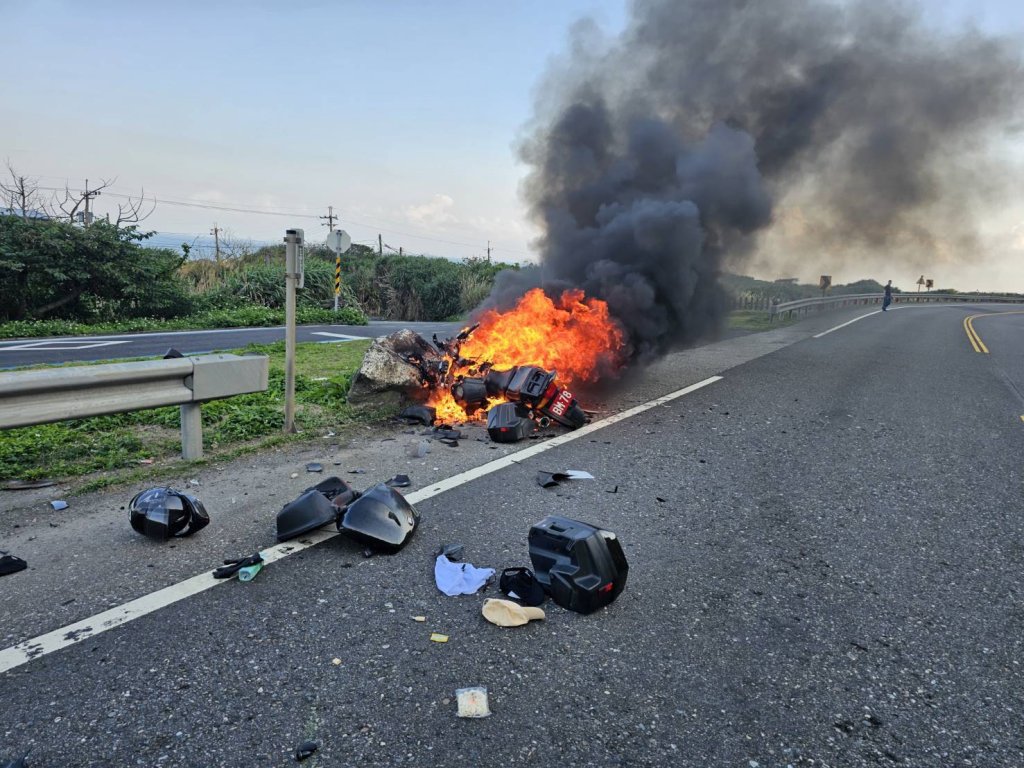【Lai傳媒、記者爆料網/周庭慶/新北報導】新北市貢寮區馬崗街40之1號前今(21)日下午發生火燒車案件!瑞芳分局於16時27分接獲報案,立即派遣福隆卯澳所及澳底車禍處理小組共4名警力到場處理,警戒指揮管制交通。經查係55歲何姓男子騎大型重機車搭載乘客44歲林姓女子,沿台2線由宜蘭往基隆方向行駛,行經案發地點不明原因自撞路旁護欄,致該車起火燃燒,火勢於17時5分許撲滅。