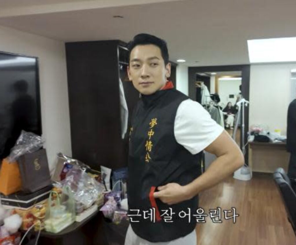 影片中,Rain在後台拆禮物時收到這件極具台味的宮廟背心,對上面的中文字感到相當好奇,還特地詢問意思。隨後他大方把背心穿上身,拉上拉鍊後對著鏡頭展示成果,臉上露出滿意笑容,完全沒有偶包。