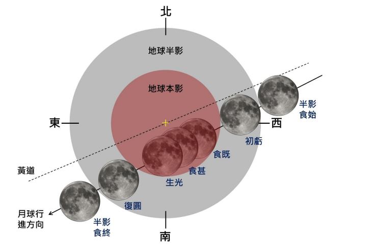 氣象署進一步指出,月食是月球在軌道上公轉運行時,正好進入地球的影子區內,原照射月面的太陽光被地球遮掩,使得月面無法反射陽光而有缺角或隱沒的天文現象。在「全食階段」,月面完全隱沒在地影內,但並不會完全看不見,而是呈現暗淡的紅銅色,這是因為陽光在穿過地球週邊的大氣層時,部分的紅色光被大氣折射至月面所致。
