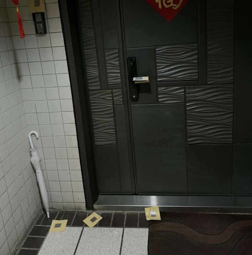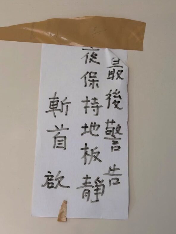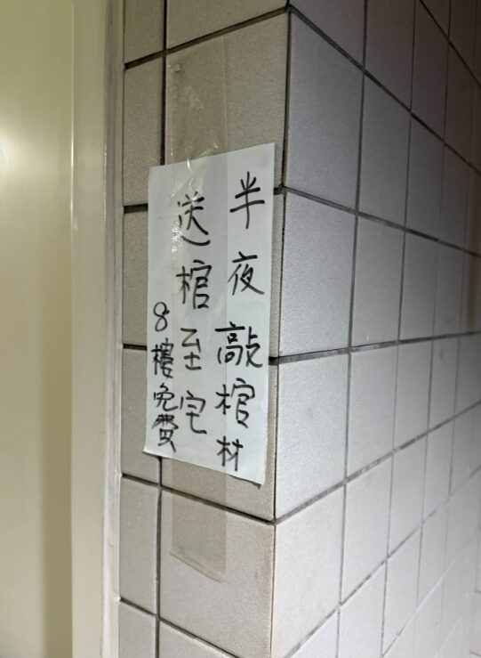原來,這位樓下鄰居的「抗議方式」早就不是貼個紙條這麼簡單。1月17日,對方在門口留下字條:「半夜敲棺材,送棺至宅」;2月17日再升級,紙條寫著「最後警告,夜保持地板靜,斬首啟」。對方甚至向管委會聲稱曾「拿鐵鎚敲過她家大門」——但事主說,她完全沒聽到任何人敲門。這到底是誰在說謊,還是對方根本就沒去敲、只是想嚇人?