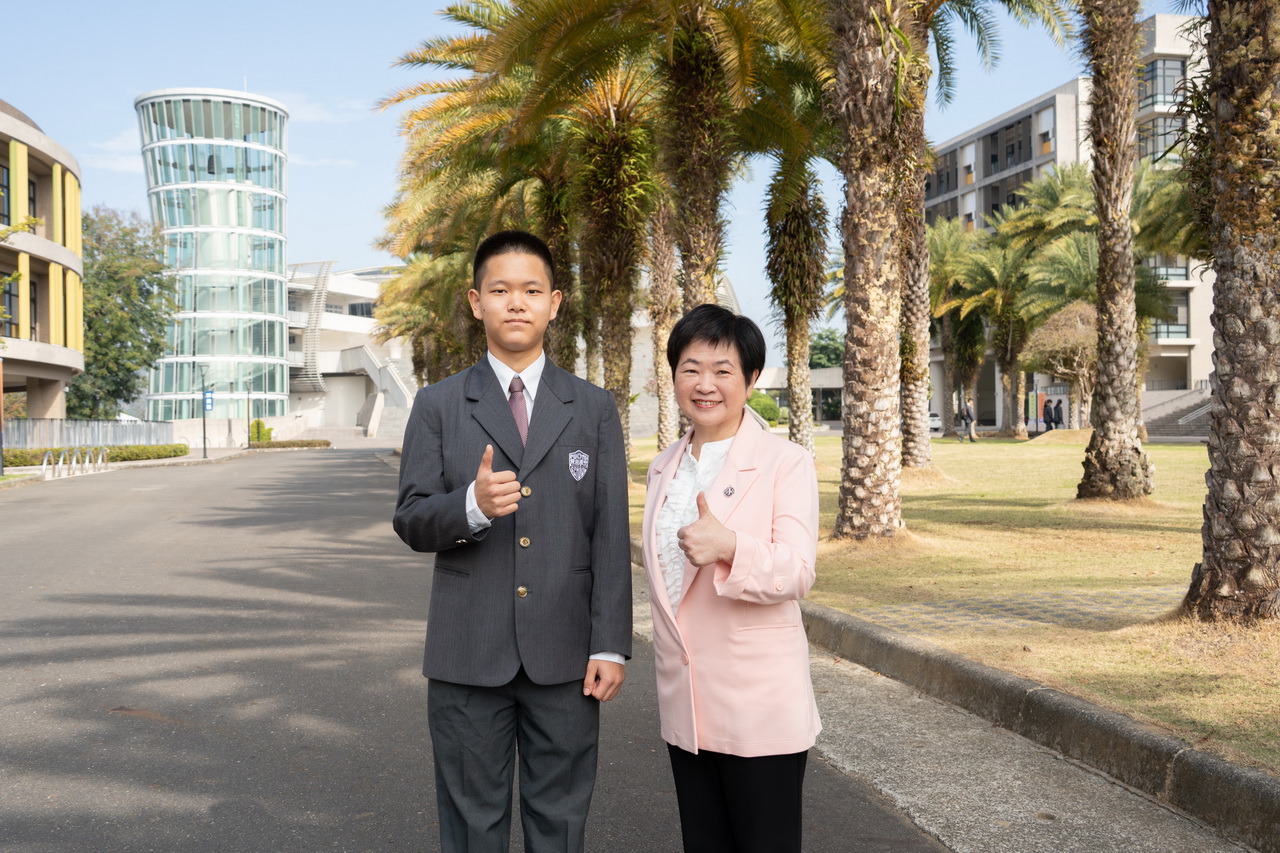 ▲南投縣私立普台高中張哲瑞,學測英文、自然、社會滿級分「三冠王」,開心與普台高中校長惠沁宜合影。(圖/普台高中)