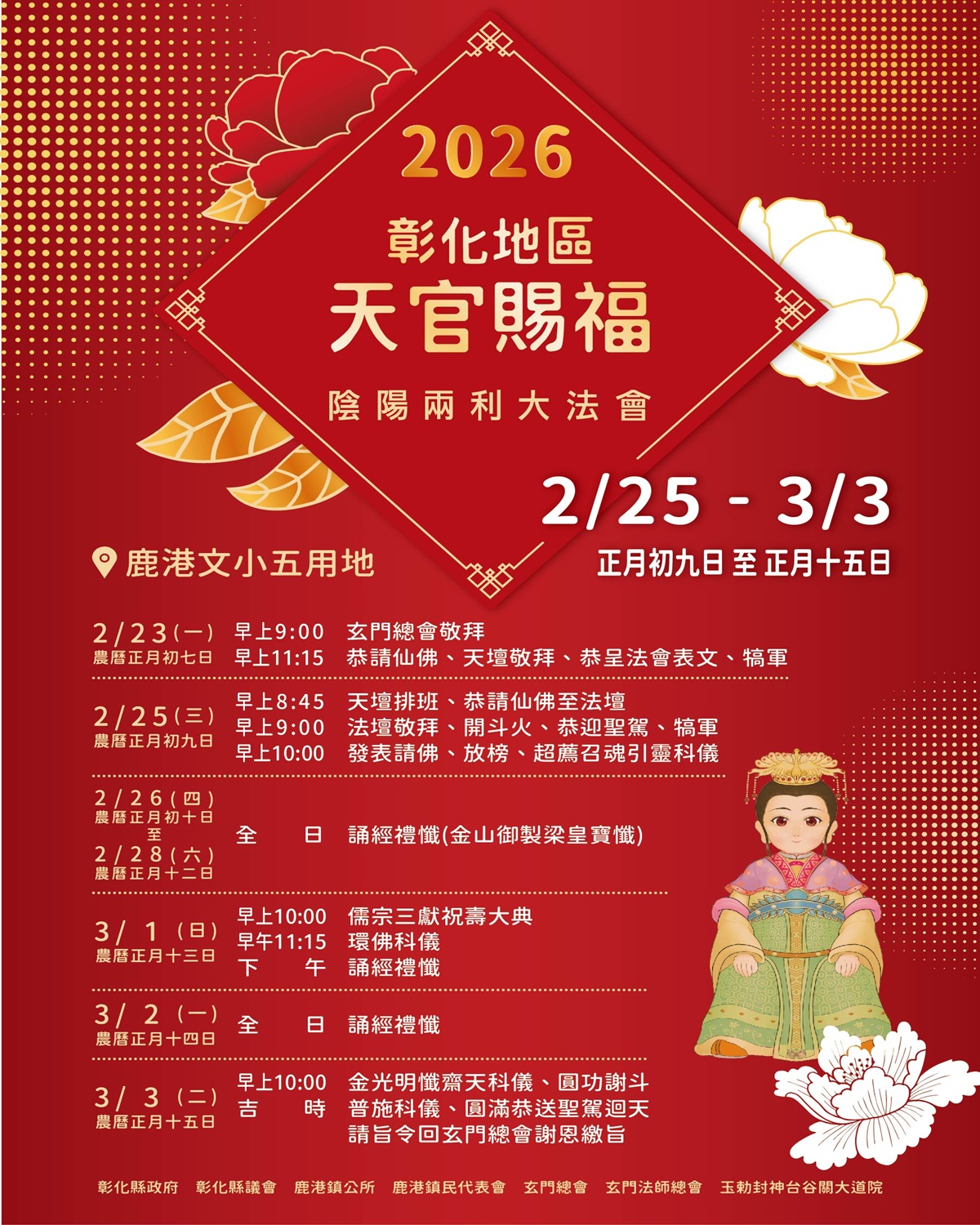 為利縣政順暢並安定民心,彰化縣政府、彰化縣議會、鹿港鎮公所、鹿港鎮民代表會與中華玄門總會訂於2月25日至3月3日在鹿港文小五用地共同辦理「115年彰化地區天官賜福陰陽兩利大法會」。彰化縣長王惠美於今(25)日上午率縣府局處主管,與本科法會大總理玄軒李宗軒、玄門總會總會長玄駿吳宏烈、玄門聖事聯盟總會總會長玄鶴葉秋吉、玄門慈善功德總會會長玄證陳宗正、芳苑無極混元文樞院代表等恭迎聖駕,祈願眾神護佑國泰民安、縣民安康、百業興隆。