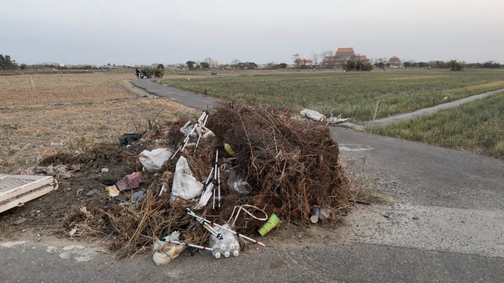 ▲腳架「提早卡位」擋農民出入 整組遭丟垃圾堆(圖/網友 林文添 提供;記者王俊勝 翻攝)