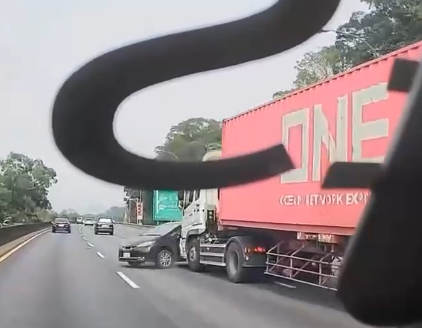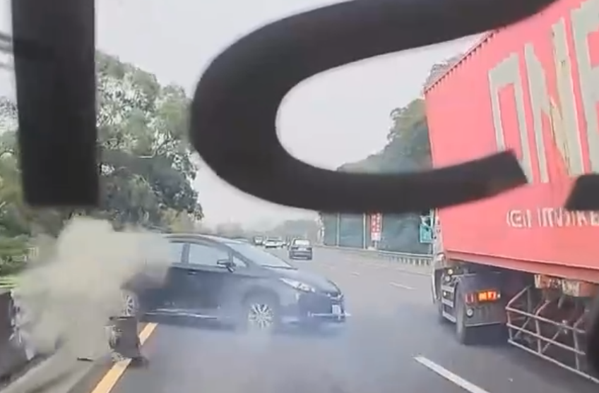 休旅車與貨櫃車擦撞後打橫向內側護欄。翻攝畫面