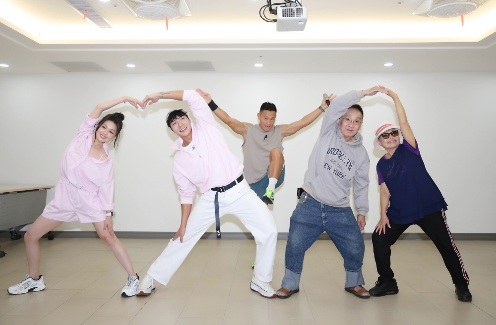 ▲PIKE SIX 健身中心的Danny 老師帶領蜜雪、江耀崙及長輩們一起大跳健康操。(圖/紅心字會提供)