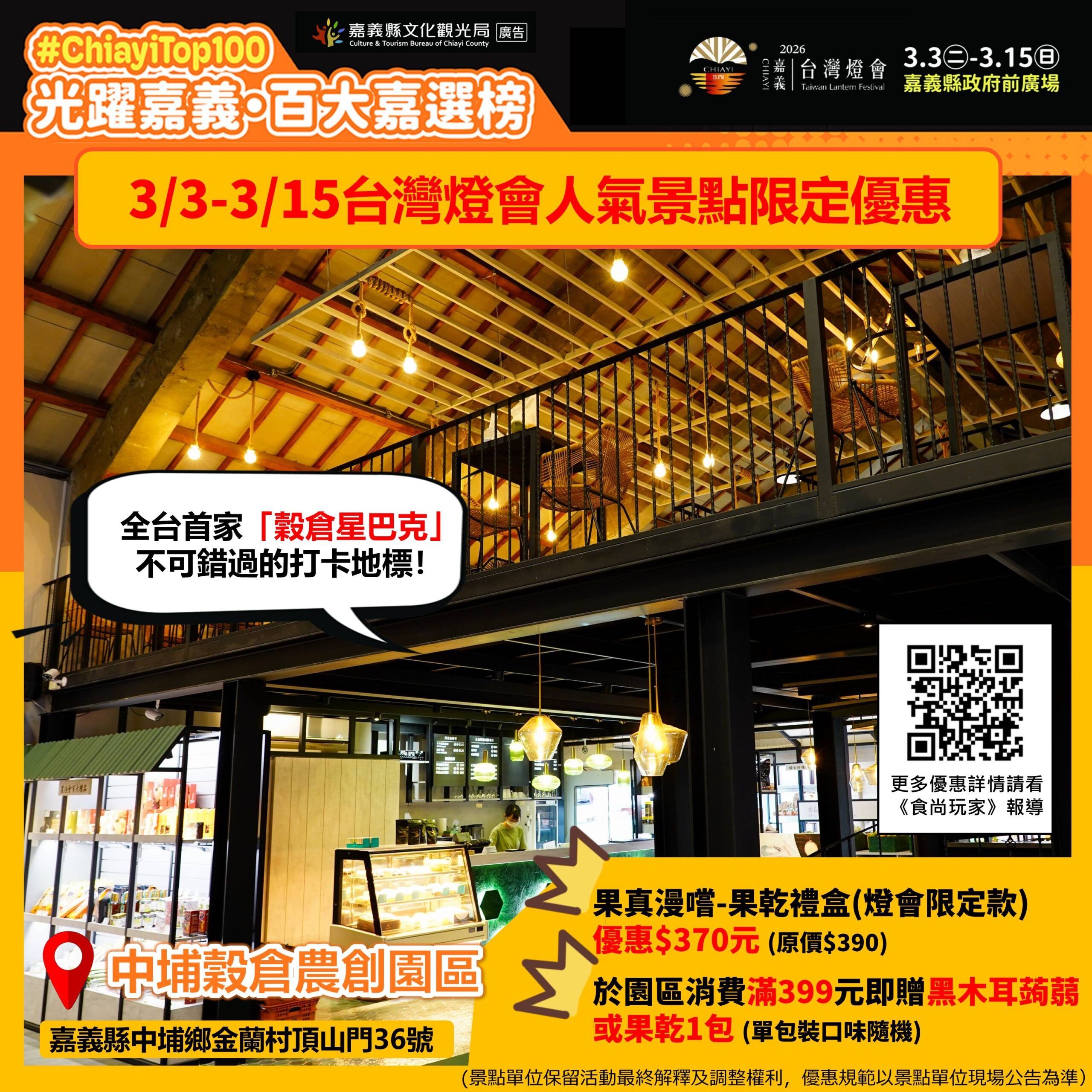 「中埔穀倉農創園區」單筆滿399元贈黑木耳蒟蒻或果乾乙包,並推出燈會限定款禮盒優惠價370元;「粉牛樂園體驗農場」於台灣燈會期間推出全票1+1優惠,購買全票1張即可再帶1人免費入園,結帳時主動告知優惠代碼「7715」即可享優惠。