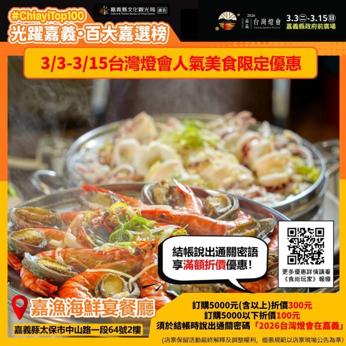 其中,「雨豆樹」凡出示食尚玩家官網優惠報導截圖或來店打卡,即享全商品95折;「品安豆花店」推出豆花品項買十送一,且加購「紅骨仙草凍」僅需銅板價5元(原價10元);「嘉漁海鮮宴餐廳」只要於結帳說出通關密語「2026台灣燈會在嘉義」,可享訂購滿5000元現折300元,未滿5000元亦可現折100元。