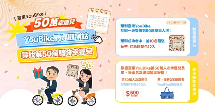 臺東縣環保局說明,為迎接突破50萬騎乘人次的重要時刻,特別推出臺東 YouBike 累計騎乘人次「預測達標日抽好禮」活動,成功預測者可參加抽獎,有機會獲得臺東在地特色名產紅烏龍茶包組;而「第 50 萬名騎乘幸運兒」將可獲得新臺幣500元電子禮券 1 份,適用於通路包含王品集團、統一超商、全家便利商店、大全聯、foodpanda、家樂福、屈臣氏、寶雅、特力集團及爭鮮集團等多元品牌;「前、後各2名使用者」將可獲得YouBike運動提袋,期盼透過活動設計,帶動更多民眾以實際行動支持綠色交通。活動詳情可至 (https://activity.youbike.com.tw/) 參加。