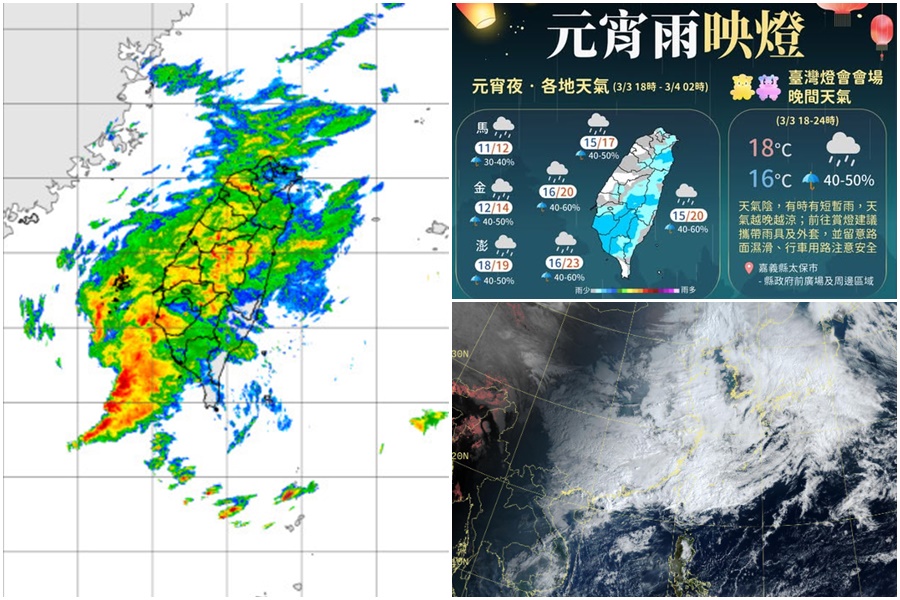 今天3月3日元宵節,受東北季風或大陸冷氣團影響,各地天氣轉涼;又因華南雲雨區東移,今日臺灣各地及澎湖、金門、馬祖有短暫陣雨,西半部地區並有局部較大雨勢發生的機率,氣象署早上發出大雨特報,南投地區有局部大雨發生的機率,請注意瞬間大雨及強陣風。