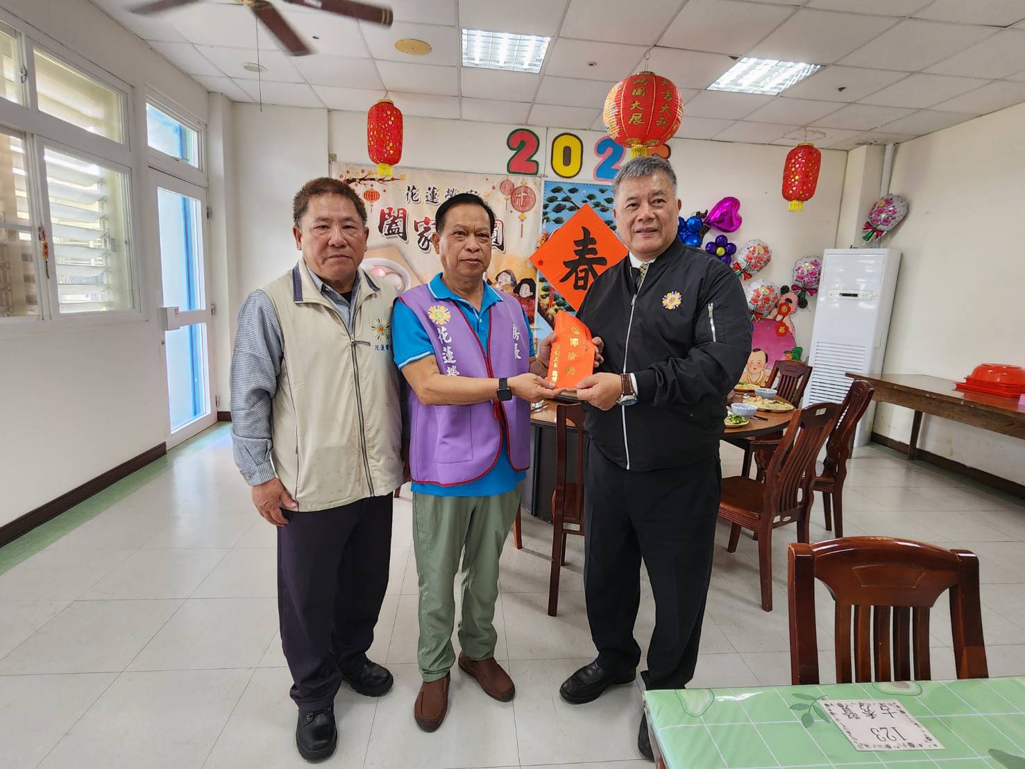 ▲副主委吳志揚(右)代表致贈加菜金,榮家主任游文勇(左)陪同長青堂房長賴冠穎(中)代表領受。(圖/花蓮榮家提供,下同)