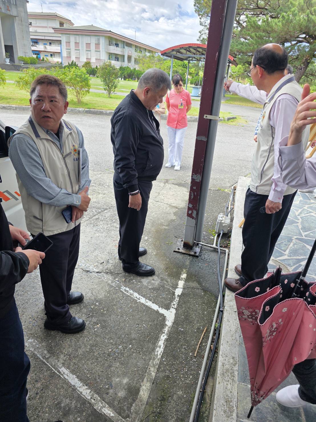 ▲副主委吳志揚(中)仔細現勘停車棚鐵柱底座鏽蝕狀況,要求以水泥包覆方式強化結構。
