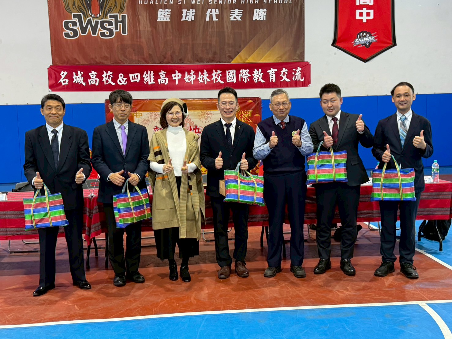 ▲日本名城高校師長獲贈土本手提袋,相當感謝四維高中董事長黃淑怡(左三)與校長蔡忠和(右三)。(圖/四維高中提供,下同)