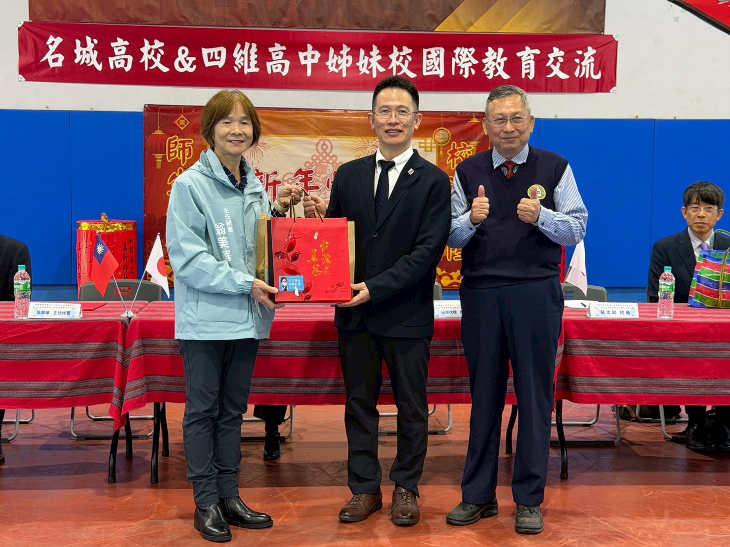 ▲花蓮市公所主任秘書翁美華(左)致贈日本名城高校伴手禮,由副校長米原次穂(中)代表接受。
