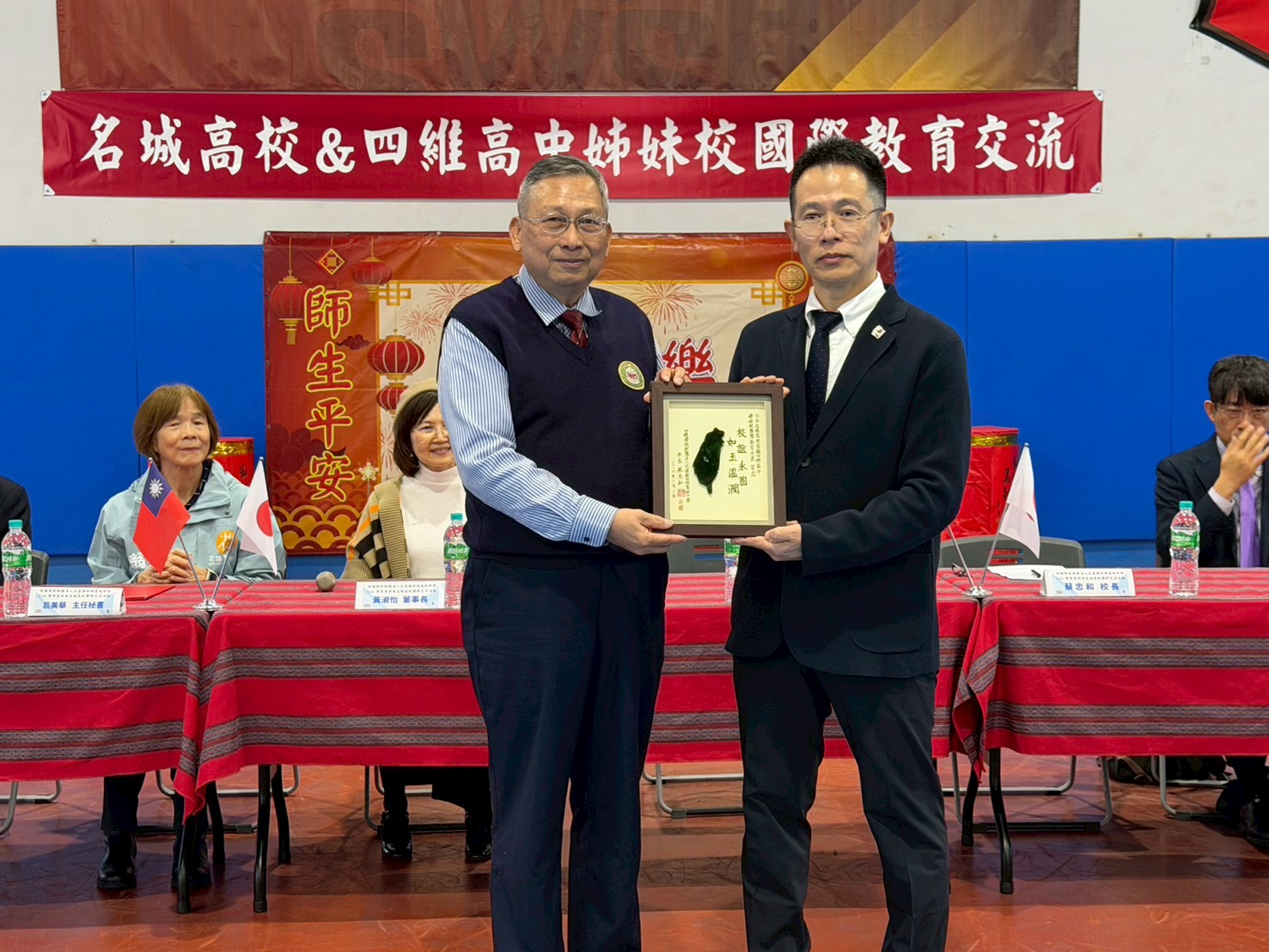 ▲花蓮四維高中校長蔡忠和(左)致贈日本名城高校副校長米原次穂(右)本土玫瑰石匾。