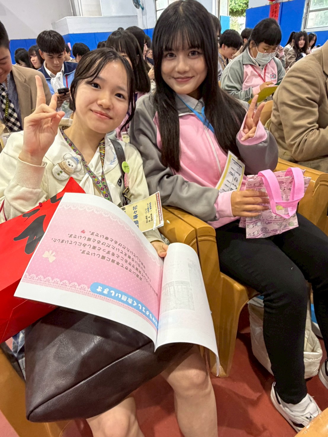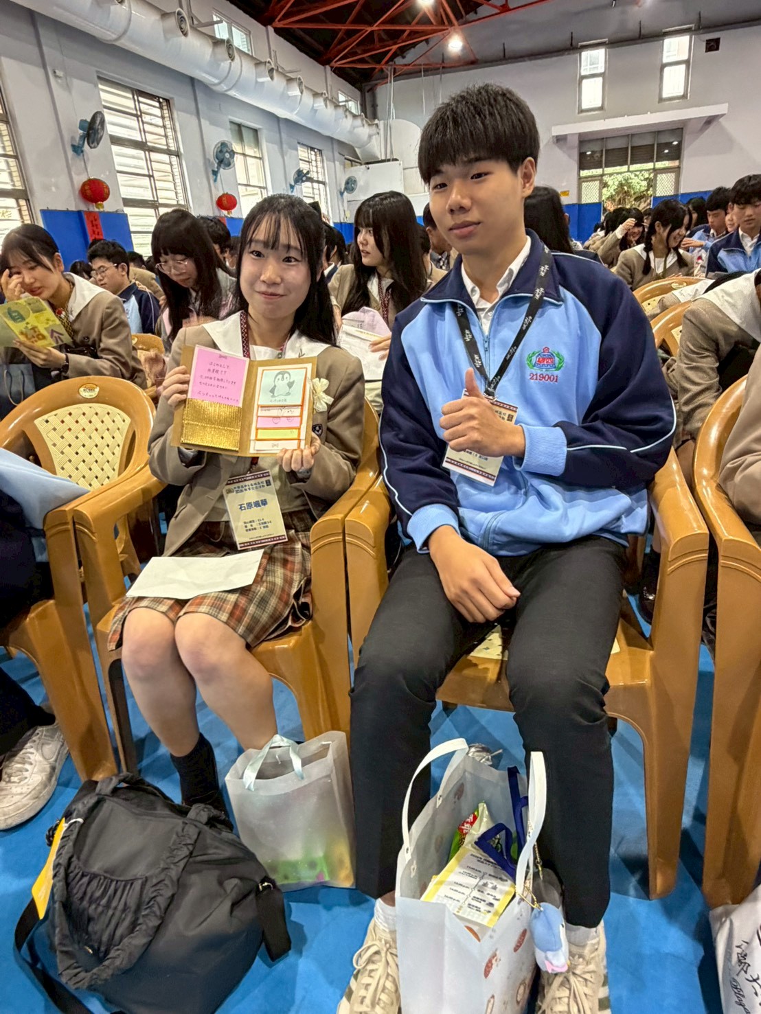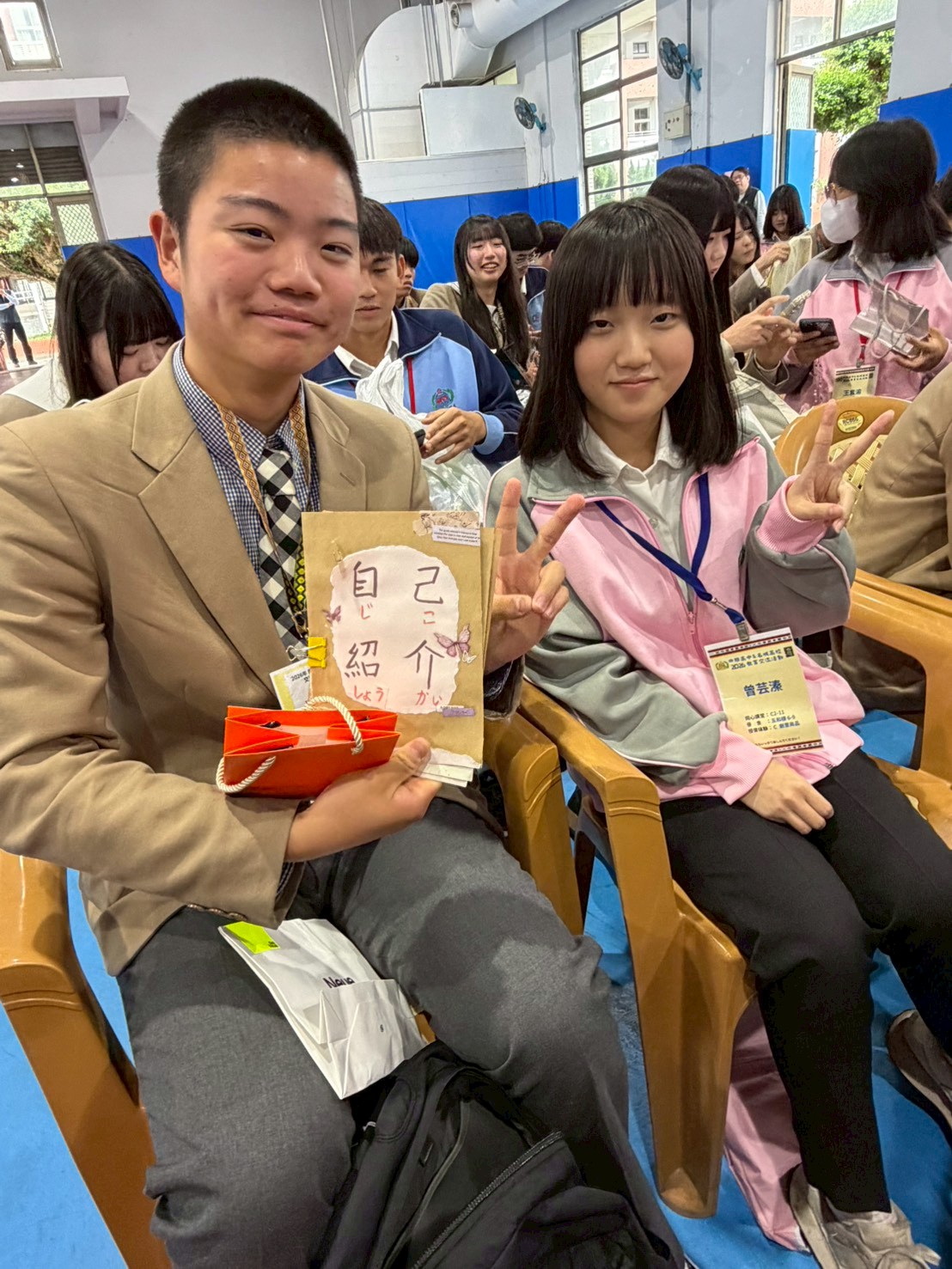 ▲花蓮四維高中學生(右)與日本日本名城高校學生(左)愉快互動。