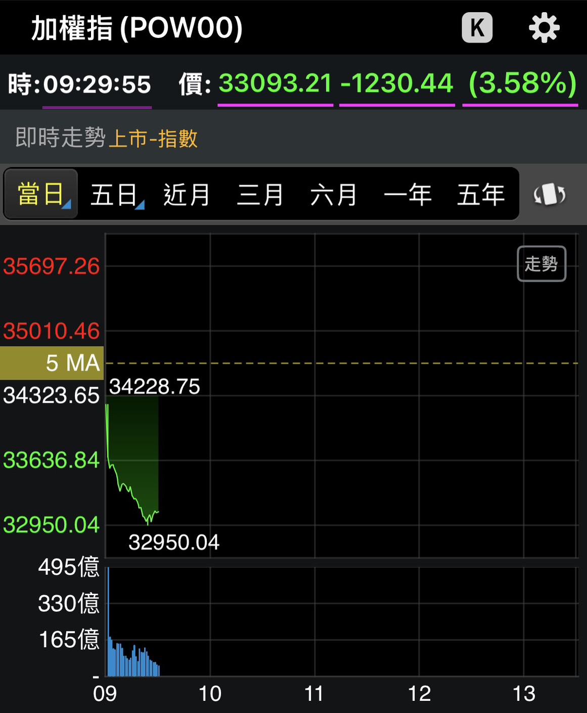 中東戰火升級,外資急忙提款,不僅日、韓股遭受波及,台股也慘遭血洗,一早9時29分,加權指數下跌1230點,來到330932點,事實上,稍早一度跌破33000點,最低來到32950點,後續暫時回穩。