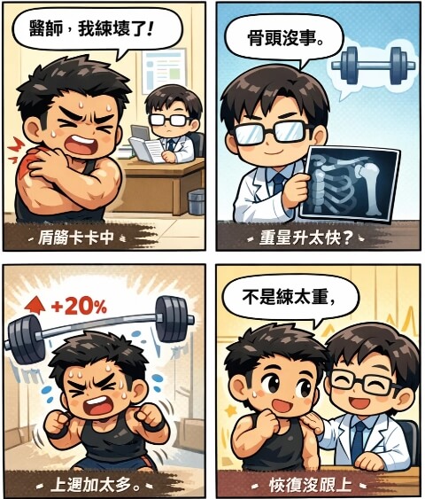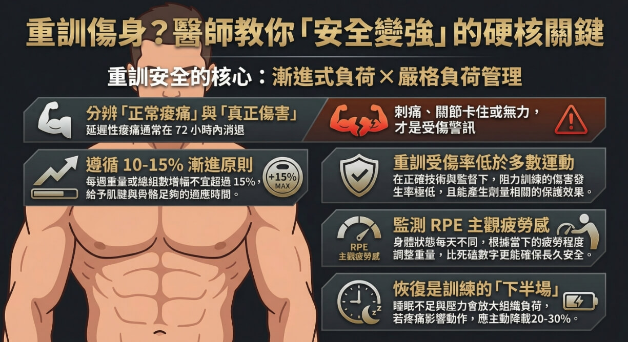 不過,別小看這一點。痠痛和受傷的差別在於「時間與功能」。如果疼痛超過 72 小時仍未改善,或出現關節卡住、刺痛、無力等影響動作控制的狀況,就不能再用「正常痠」來解釋。近期對訓練負荷與傷害關聯的系統性分析指出,傷害風險多與訓練量突然上升或恢復不足有關,而不是單一次的重量刺激 (註2)。所以,重訓安全的第一個判斷原則不是「會不會痠」,而是「負荷增加是否太快、恢復是否足夠」。痠痛可以是成長訊號,但若忽略恢復,它也可能成為預警燈。