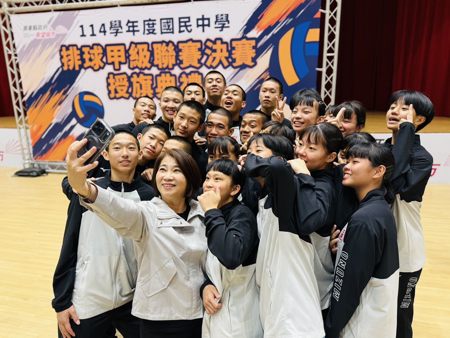 【記者戴英薇/屏東報導】 屏東縣新園國中男子及女子排球隊雙雙晉級114學年度國民中學甲級排球聯賽(JHVL)決賽,將於3月6日至3月8日於雲林縣立體育館盛大舉行,屏東縣政府在縣府大禮堂舉行授旗典禮,由縣長周春米授旗並致贈加菜金,為即將出征全國賽的選手加油打氣。典禮簡單隆重,球員們齊聲喊出隊呼,精神抖擻、信心十足,由新園國中校長揮動大旗象徵出征,現場士氣高昂。