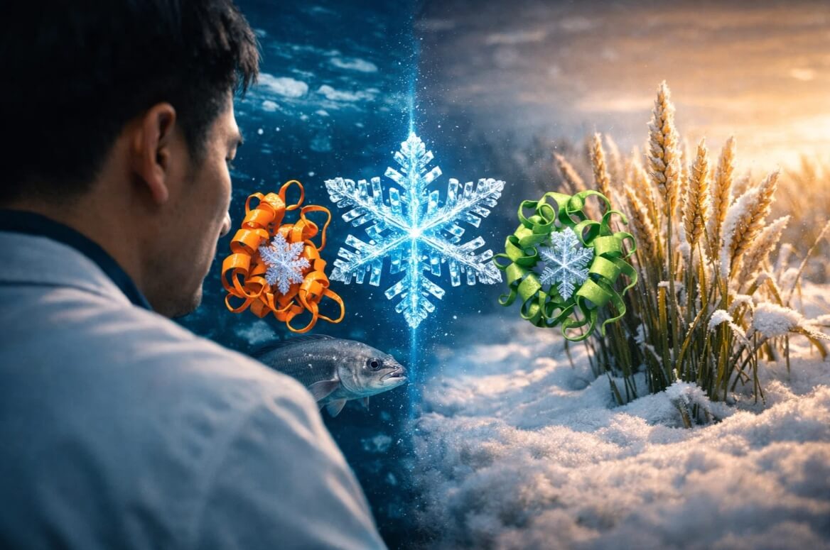 你知道嗎?很多人以為只有極地魚類才有抗凍能力,其實小麥抗凍蛋白也在自然界默默扮演重要角色。所謂抗凍蛋白(Antifreeze proteins, AFPs),是一類能夠附著在冰晶表面的蛋白質,它們不會像防凍液那樣降低溫度,而是改變冰晶的生長方式。當水開始結冰時,冰晶通常會越長越大,就像冷凍庫裡的冰塊逐漸變粗一樣;但抗凍蛋白會貼在冰晶表面,阻止冰晶繼續擴張,這個現象被稱為冰晶再結晶抑制(Ice Recrystallization Inhibition, IRI)。
