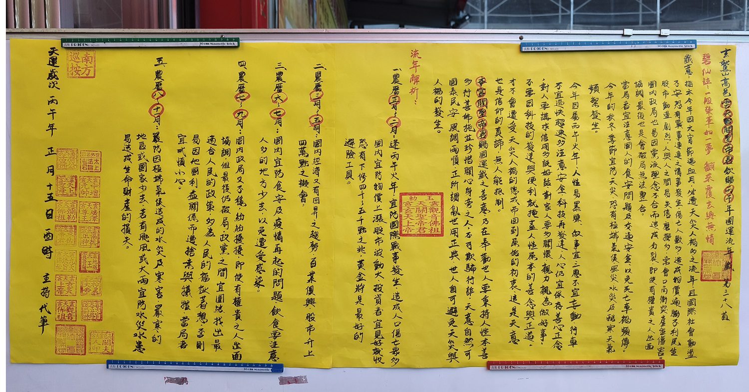 農曆新年過後,各地廟宇紛紛公布年度國運籤,成為民間觀察時局的重要指標。高雄市鳥松區玄鷲山高邑雲天宮今年抽出的丙午年國運籤,被解讀為「下下籤」,廟方依照傳統在元宵節正式解籤。主持曾俊豐指出,籤詩內容顯示今年整體運勢動盪,除國際局勢可能出現戰事與衝突外,全球經濟、股市及氣候變化也將面臨多重考驗,提醒民眾凡事謹慎以對。
