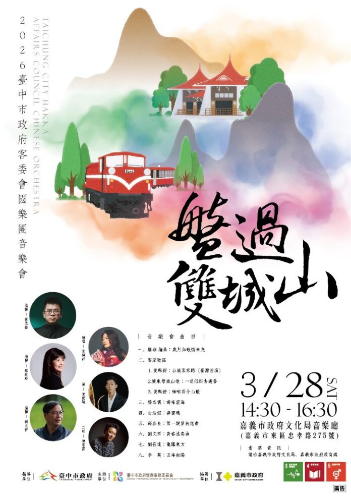 臺中市政府客家事務委員會將於3月28日(星期六)下午 2 時30分,首度移師「管樂之都」嘉義市,於文化局音樂廳舉辦「2026 臺中市政府客委會國樂團音樂會‧盤過雙城山」。此次演出以「雙城交流」為核心,將臺中山城的客庄壯麗美景轉化為動人旋律,邀民眾共賞一場跨越城市的文化交響。