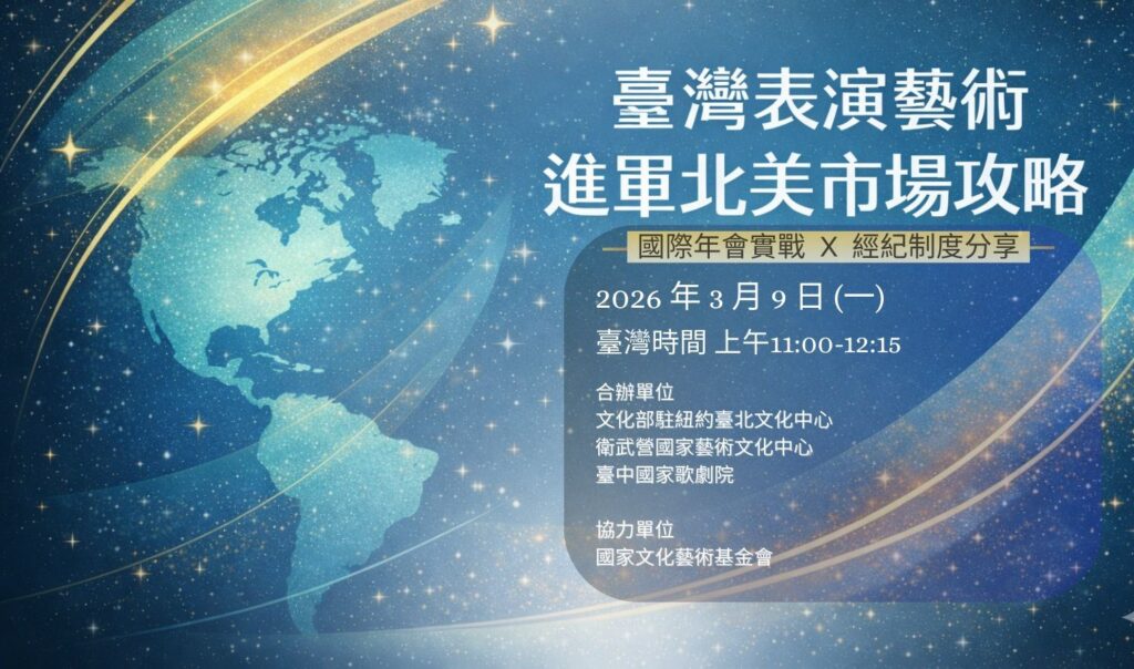 為協助臺灣表演藝術團隊掌握拓展北美市場的關鍵實務,文化部駐紐約臺北文化中心聯手衛武營與臺中國家歌劇院,將於3月9日舉辦「臺灣表演藝術進軍北美市場攻略」線上分享會,期盼藉由第一線產業觀察與團隊實戰經驗,向國內表演藝術工作者分享邁向國際的思維與策略。