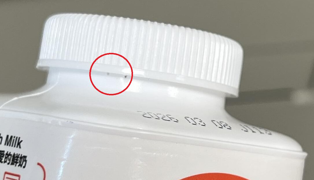 民眾超商買鮮乳發現瓶口有疑似針(紅圈處)。翻攝畫面