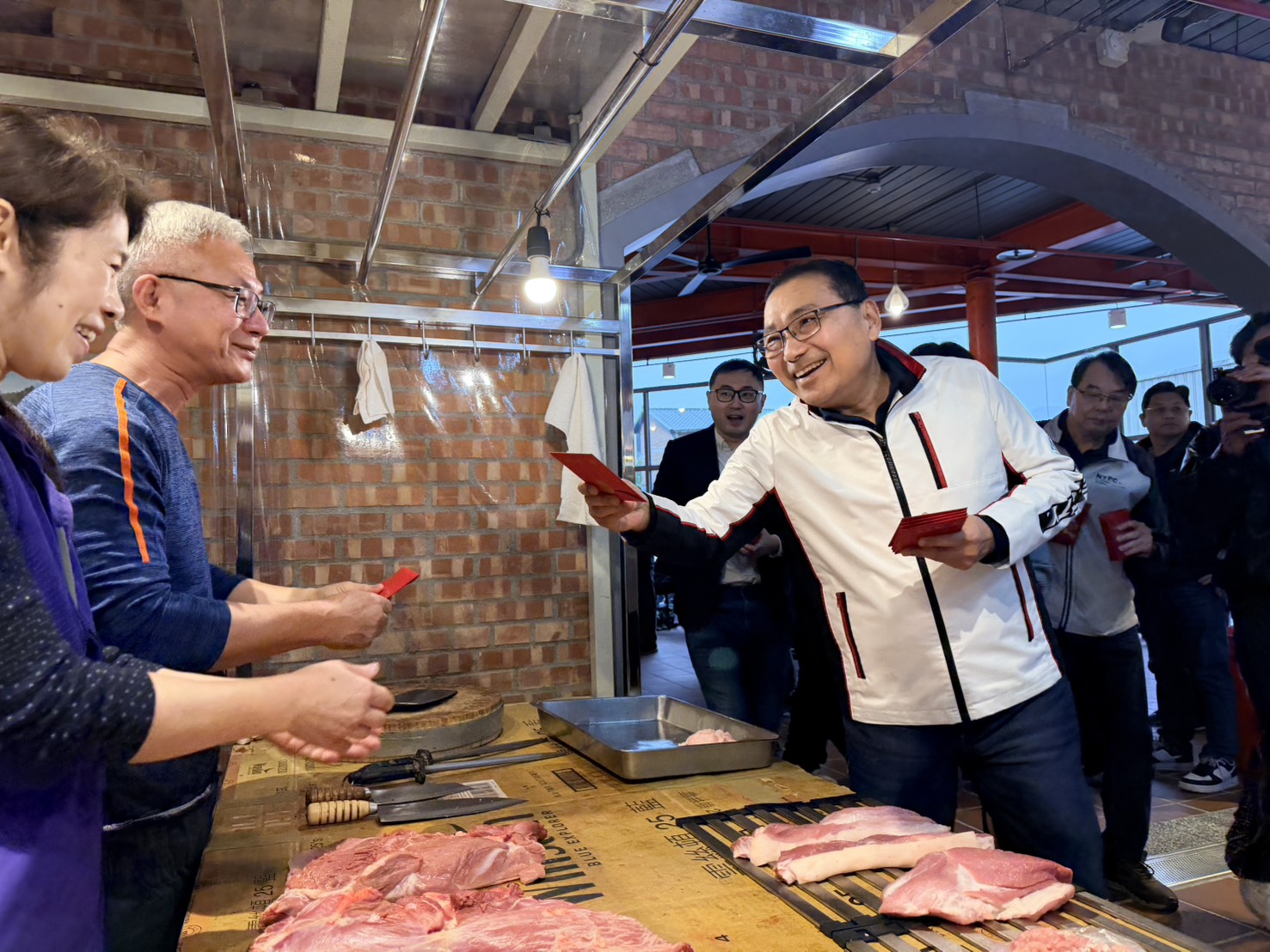 ▲侯友宜蒞臨金山中繼市場開幕活動,除祈福生意興隆,也發放馬年福袋與攤商互動熱絡。(圖/新北市市場處 提供)